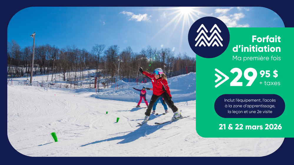 C’est votre première fois en ski? Pas de problème! initiez-vous aux sports de glisse au coût de 29,95 $ plus taxes grâce au forfait Ma Première Fois.