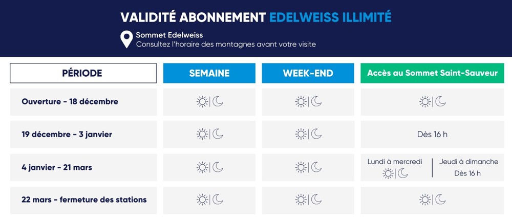 À partir du lundi 4 janvier 2027, Sommet Edelweiss est fermé les mardis.
